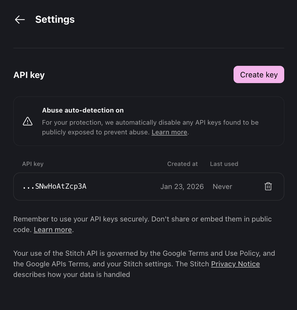 Section titled “API Key Setup”- Go to your Stitch Settings page.